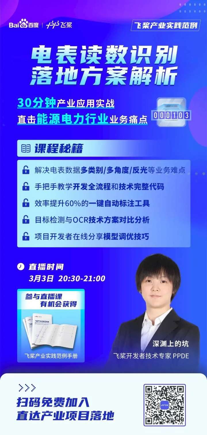 为了让小伙伴们更便捷地应用电表读数范例教程,我们邀请了飞桨开发者技术专家于3月3日20:30-21:00为大家深度解析从数据准备、方案设计到模型优化部署的开发全流程,手把手教大家进行代码实践。欢迎小伙伴们扫码进群,免费获取直播课和回放视频链接,更有机会获得覆盖智慧城市、工业制造、金融、互联网等行业的飞桨产业实践范例手册!也欢迎感兴趣的企业和开发者与我们联系,交流技术探讨合作。