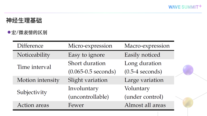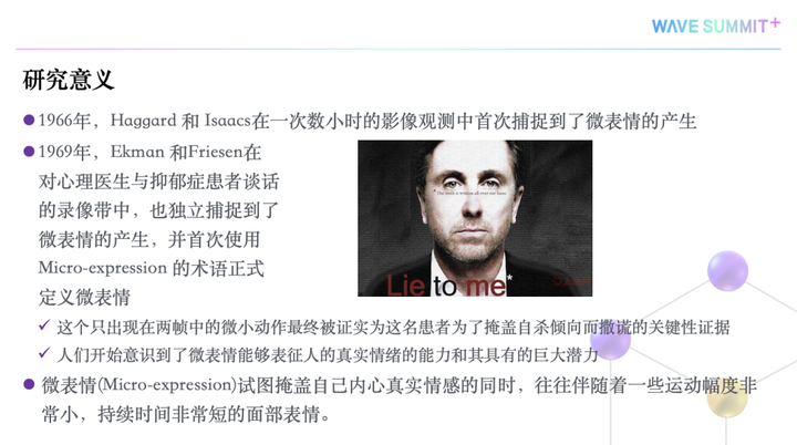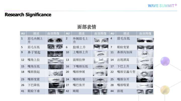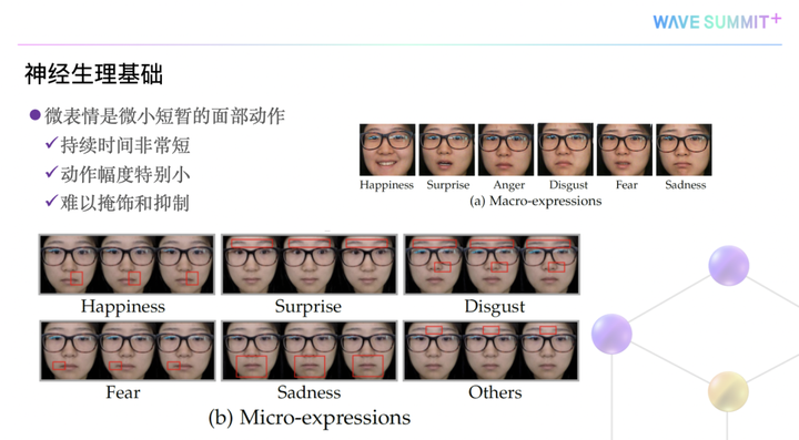 第一是微表情的识别,它最开始是通过人工训练的,大概训练一个半小时,可以提高到30%-40%的准确性,但心理学家论证了人工识别最高不会超过47%。后来随着心理学实验逐渐演进到计算机应用上面,微表情有了AU组合,如果是高兴,宏表情的高兴是AU6+AU12,微表情是AU6或者是AU12,或者是AU6+AU12。第二是微表情运动,它是局部的肌肉块运动,而不是两个肌肉块同时运动,比如高兴,运动的是AU6或者是AU12。但如果强度比较大,可能会出现AU6和AU12同时发生的情况。另外宏表情和微表情有一些联系,就是微表情的AU可能是宏表情AU的子集。