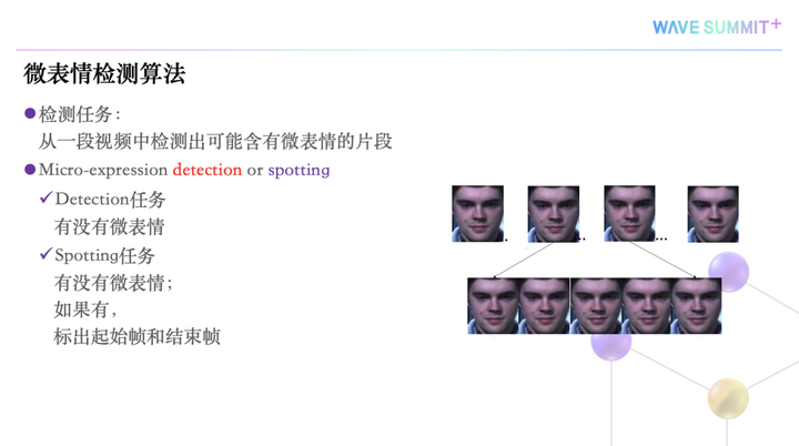 我们说微表情检测有两种方法,一个是detection,它是检测有没有微表情发生;一个是spotting,它是除了检测微表情有没有发生,如果有发生,还要标注出来微表情发生的起始时刻、终止时刻、高潮时刻。