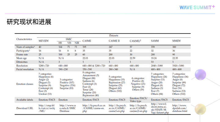 对此我们进行了优化,一方面从人员的数量上进行了优化升级,人脸分辨率和图像的分辨率尽量做大。另一方面对于人表情情绪的分类,做到了更精确,同时样本的均衡性要比其他的库好。最后,我们发布的一个数据集MMEW,它包含同一个人的宏表情和微表情的样本,这是现有的数据库做不到的。四、现有的数据库、微表情的特征、检测算法、识别算法、应用、已有方法比较、未来可能的研究方向展望。