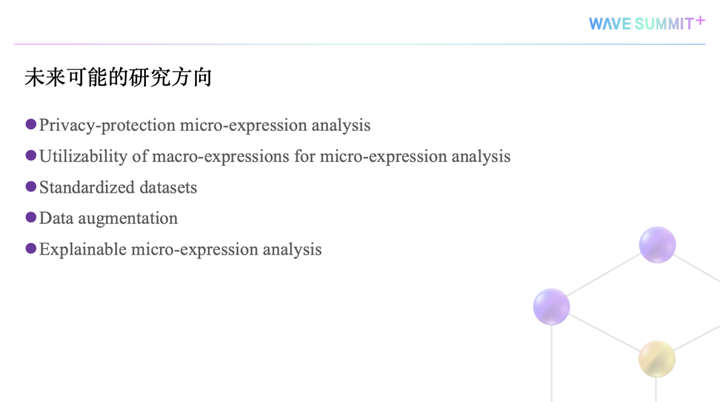 其次我们可以去迁移一些相关领域的知识,比如说宏表情和微表情比较相近,那么能不能把宏表情的特征迁移学习到微表情识别呢?这将是一个值得学习的方向。对于数据集,现在我们团队有一个800多个样本的库,可即使把所有可获取的微表情样本全部加到一块,还是非常小。最后,因为微表情在采集的时候是通过高速摄像机,所以从网上搜索的一些数据满足不了这个帧频,只能够通过采集的方式获取。我们可以采用众筹的方式,把的数据集做的更标准化一些。还可以采用生成技术,进行一些微表情的生成,帮助我们更好的去识别微表情。因为现在深度学习比较热,所以我们需要做可解释的微表情识别。