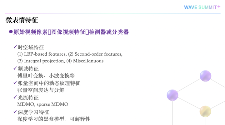现在较好的微表情特征分成这样几类,有时空域特征、频域特征、光流特征,深度学习特征。