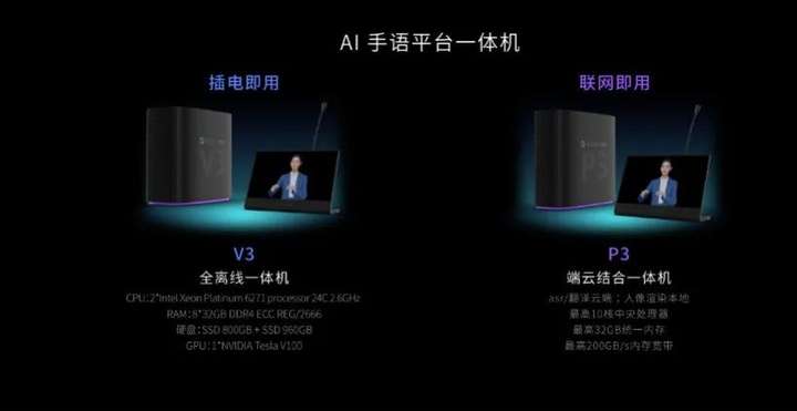 对于诸如医院、银行、机场等线下场景,一体化产品的优势正在逐渐放大。百度智能云曦灵此次发布的全离线一体机 V3 以及端云结合一体机 P3,搭载了“AI 手语平台”的核心功能,具备联网即用、开机即用的特性,可实现 AI 手语翻译对线下场景的快速支持,让“AI 手语平台一体机”像手机、电脑一样可快速、批量的生产,并渗透到生活的各个角落。