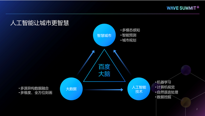 首先讲一下我们项目研发的方法论。我们可以用一个三角形来表示大数据、人工智能和智慧城市之间的关系。百度的大数据的优势体现在多个方面。百度是国内唯一一个同时拥有海量的搜索数据和地图数据的人工智能公司。百度是国内最大的搜索引擎公司,同时百度地图也是国内应用最广泛的电子地图移动app。正是这些海量的动态时空大数据和互联网大数据,实现了城市的数字化,让我们更快更直接地感受城市的变化规律。这为更好地建设智慧城市提供了必要的数据基础。同时,大数据也为人工智能提供了燃料,对训练机器模型是必不可少的。这样大数据和人工智能共同为智慧城市的建设,提供了必要的数据和技术支撑。