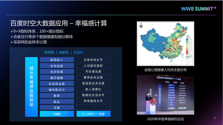 去年,我们的指数框架还新增了一个X指数,用于覆盖每年的时事热点,2020年的X指数是基于“新冠疫情”事件研发的“大数据抗疫指数”。相对于传统的问卷调查和统计方法,百度城市幸福感指数具有科学性、创新性和全面性等优势。