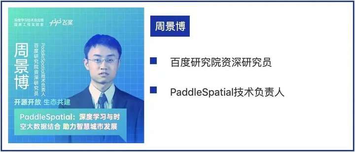 PaddleSpatial是基于百度飞桨深度学习框架开发的时空大数据计算工具和平台,融合了百度领先的区域分割、时间序列、城市迁移学习等时空数据处理能力。本次将由百度研究院资深研究员、PaddleSpatial技术负责人周景博,为大家分享PaddleSpatial如何实现深度学习与时空大数据的结合,以助力智慧城市发展。