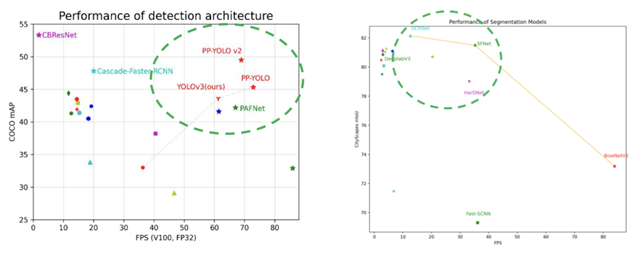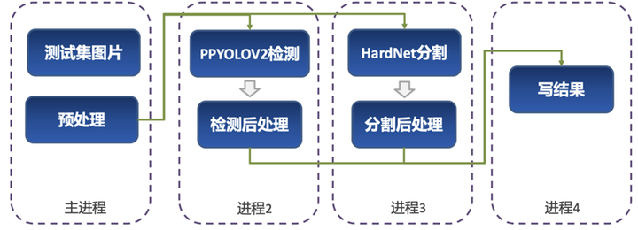 PaddleDetection中的PP-YOLOv2和飞桨图像分割套件。PaddleSeg中的HardNet模型作为Baseline模型进行相应的优化,使用多进程异步处理,进一步提升了部署性能。