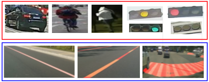 数据难:同一个目标(标签)在不同的环境下呈现的形态差异大,如实车道线和虚车道线在城乡结合区域难以区分;数据存在小样本和样本不均衡的问题,车辆行人标签多,红绿灯数据相对较少。