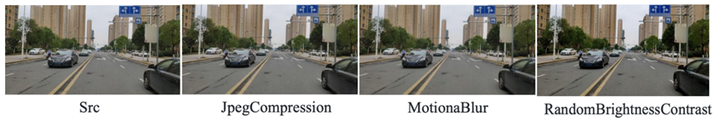 2、为了提高模型的泛化能力,针对车载摄像头的场景,在训练全过程中随机加入albumentations库中的JpegCompression(降画质) 、MotionaBlur(运动模糊)、RandomBrightnessContrast(亮度对比度)等数据增强的方法。