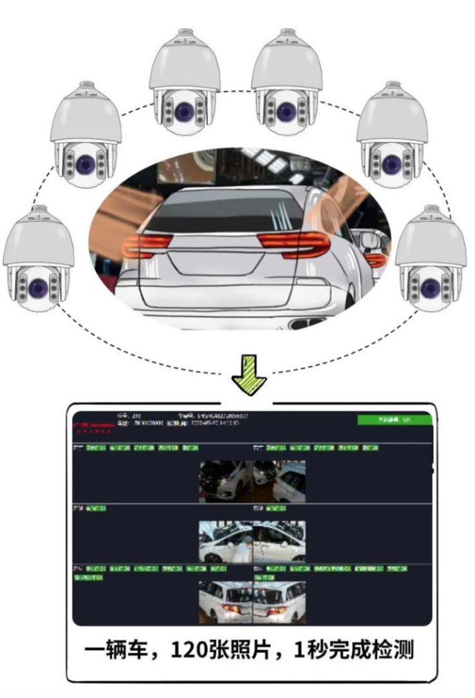 - 快:针对单一车型的22种以上车灯,可通过7台相机同步拍摄,同步计算120张细节图片,检测全程仅需1秒;
