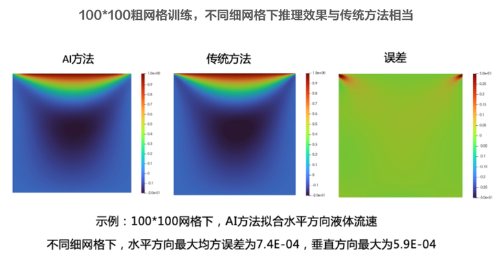 (3)泛化优势AI方法解决问题分为训练和推理两个过程,一次训练,多次推理。借助神经网络的泛化能力,在某些物理参数条件下训练出的网络,在其他物理参数下也可以获得很好的模拟效果。