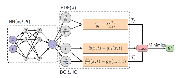 AI+科学计算领域中最著名的方法是PINNs(Physics-informed neural networks)方法,该方法提出一种新的复合型的损失函数,由偏微分方程组部分,边界条件部分,初始条件部分三部分组成。