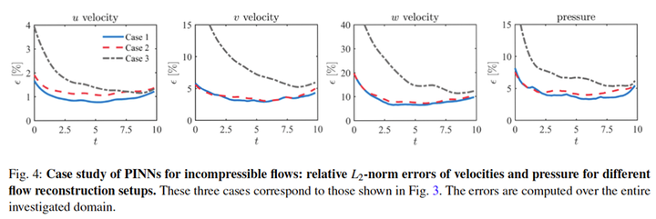 由于加入了物理信息约束,该方法在没有任何输入数据的情况下,只指定边界条件和初始条件,就可以训练出神经网络拟合目标PDE的解。也有一些学者在原始PINNs方法的基础上进行改进,加入一些数据,形成偏微分方程部分、边界条件部分、初始条件部分、数据部分4部分组成的损失函数,进一步提高神经网络的模拟精度,在3D不可压的流体问题上取得了不错的结果。如下图所示,分别对三种不同case使用PINNs算法基于二维二元观察速度进行了3D流场重建,并计算了三种case中不同方向速度及压力的L2范数相对误差。可以发现PINNs方法可以精准捕捉漩涡脱落的不稳定性。