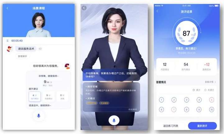 智能培训产品采用语音识别/合成、自然语言理解、数字人等 AI 技术,通过人机交互能力,还原真实的业务场景,面向学员提供实景练习、智能仿真考试,系统实时对学员进行评估、给予指导,降低新员工上岗时间、快速提升开口应答技巧及业务能力。