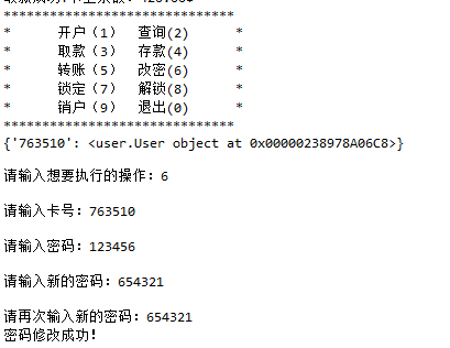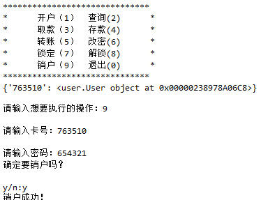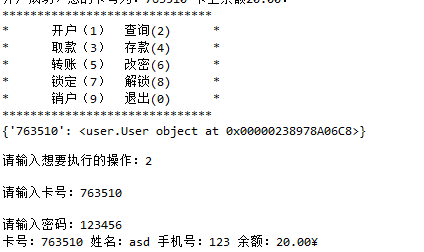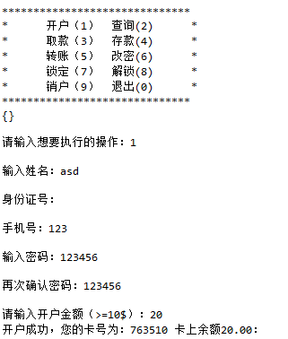 print('开户成功,您的卡号为:%s 卡上余额%.2f:'%(num,money))