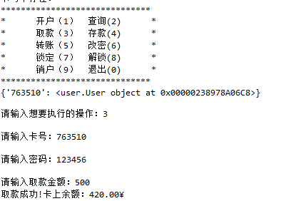 print('取款成功!卡上余额:%.2f¥'%(user.card.money))