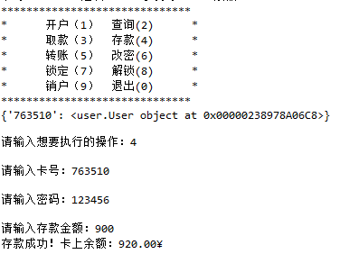 print('存款成功!卡上余额:%.2f¥'%(user.card.money))