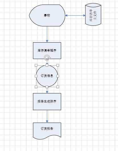 该装配厂使用一台小型计算机处理更新库存清单主文件和产生订货报告的任务。零件库存量的每一次变化称为一个事务,由放在仓库中的CRT终端输入到计算机中;系统中的库存清单程序对事务进行处理,更新存储在磁盘上的库存清单主文件,并且把必要的订货信息写在磁带上。最后,每天由报告生成程序读一次磁带,并且打印出订货报告。