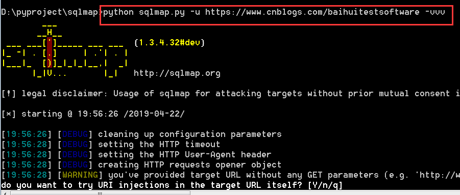 python sqlmap.py -u https://www.cnblogs.com/baihuitestsoftware/articles/10240221.html -vvv