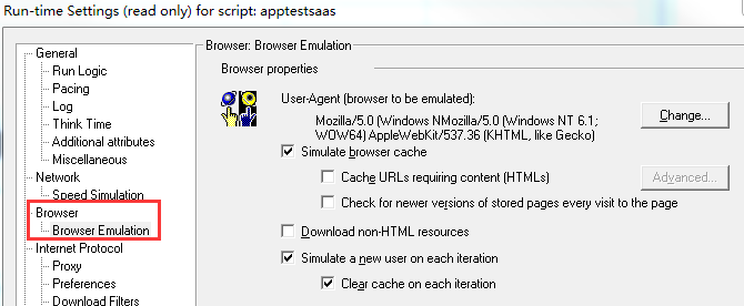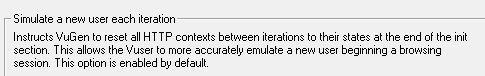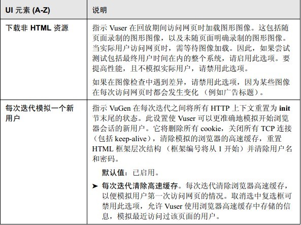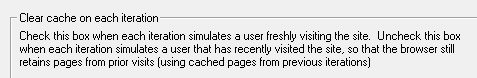 每次迭代时清除浏览器缓存,以模拟第一次访问网页的用户。清除该复选框可以禁用此选项并允许 Vuser 使用浏览器缓存中存储的信息,模拟近期访问过该网页的用户。