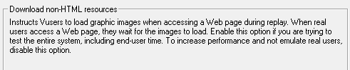 该选项指示 Vuser 在回放期间访问网页时加载图形图像。其中包括同页面一起录制的图形图像,还包括未明确同页面一起录制的图形图像。当实际用户访问网页时,需要等待图像加载。因此,如果尝试测试整个系统(包括终端用户时间),请启用该选项(默认情况下启用)。要提高性能并且不模拟实际用户,请禁用该选项。