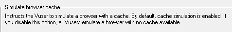 Instructs the Vuser to simulate a browser with a cache. By default, cache simulation is enable. If you disable this option, all Vuser emulate a browser with no cache avaiable.