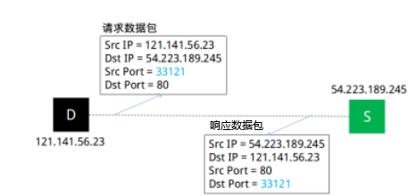 举例来说,如下图,网站服务器S(IP地址为54.223.189.245)的HTTP服务运行在80端口上,公网上的计算机D(IP地址为121.141.56.23)想去访问网站S,于是把自己绑定到本机的33121端口上,并发送请求的数据包,这个数据包中就包含了计算机D的源端口33121和目标端口80。网站S收到请求后,发送响应的数据包,这个数据包中包含了服务器S的源端口80和目标端口3312。