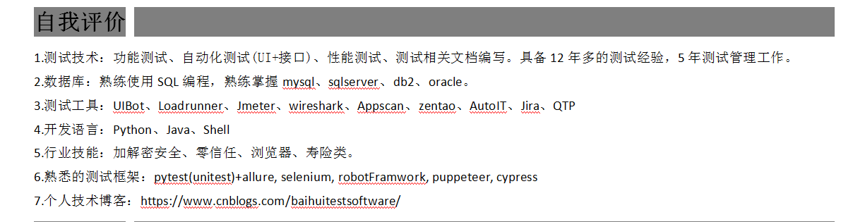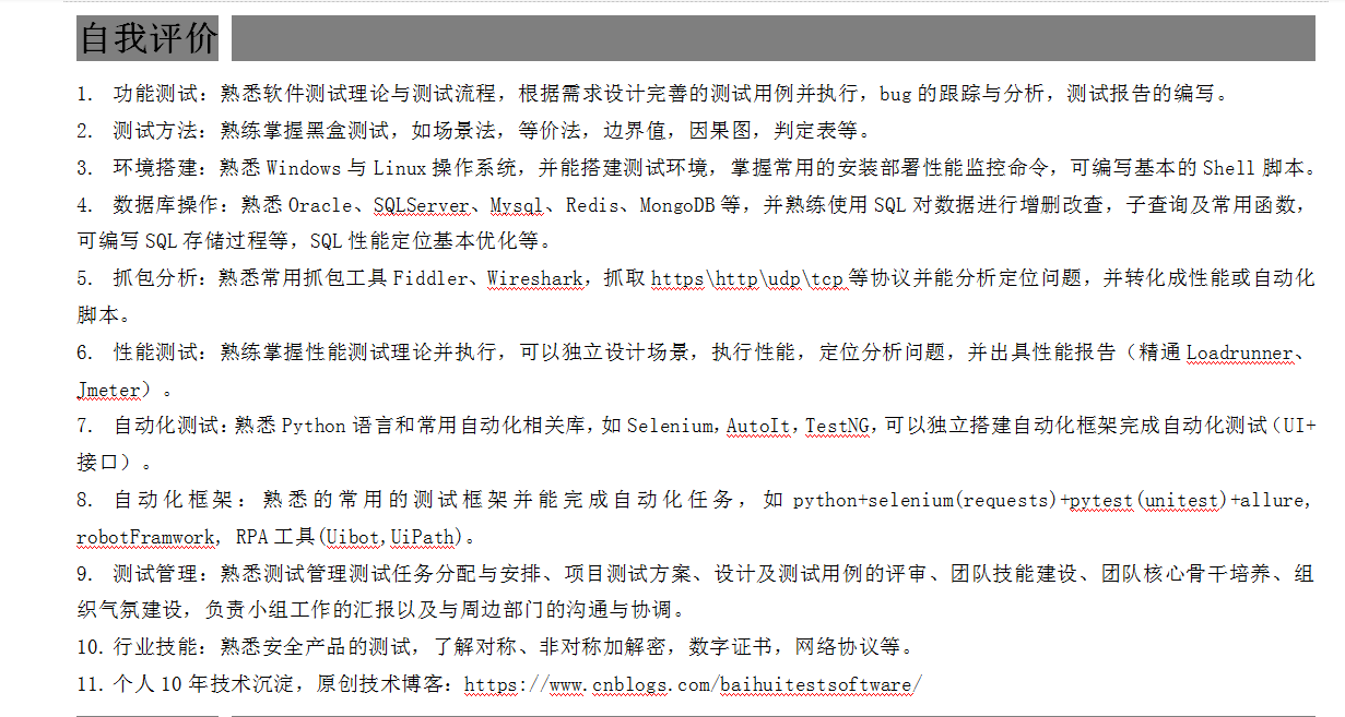 XXX 男 13岁 12 年工作经验 本科 现居住地:北京| 户口:张家口 | 职场人 手机:138XXXXX E-mail:lXXXX@126.com 求职意向 期望工作地区: 北京 期望月薪: 25000 - 35000元/月 期望工作性质: 全职 期望从事职业: 软件测试 期望从事行业: 计算机软件,人工智能,网络/信息安全 个人优势 1.功能测试:熟悉软件测试理论与测试流程,根据需求设计完善的测试用例并执行,bug的跟踪与分析,测试报告的编写。 2.测试方法:熟练掌握黑盒测试,如场景法,等价法,边界值,因果图,判定表等。 3.环境搭建:熟悉Windows与Linux操作系统,并能搭建测试环境,掌握常用的安装部署性能监控命令,可编写基本的Shell脚本。 4.数据库操作:熟悉Oracle、SQLServer、Mysql、Redis、MongoDB等,并熟练使用SQL对数据进行增删改查,子查询及常用函数,可编写SQL存储过程等,SQL性能定位基本优化等。 5.抓包分析:熟悉常用抓包工具Fiddler、Wireshark,抓取https\http\udp\tcp等协议并能分析定位问题,并转化成性能或自动化脚本。 6.性能测试:熟练掌握性能测试理论并执行,可以独立设计场景,执行性能,定位分析问题,并出具性能报告(精通Loadrunner、Jmeter),总计测试保险类(20+),电子文件类(3个),OA类(2个),安全产品服务类(5个)。 7.自动化测试:熟悉Python语言和常用自动化相关库,如Selenium,AutoIt,TestNG,可以独立搭建自动化框架完成自动化测试(UI+接口)。 8.自动化框架:熟悉的常用的测试框架并能完成自动化任务,如python+selenium(requests)+pytest(unitest)+allure, robotFramwork, RPA工具(Uibot,UiPath)。 9.测试管理:熟悉测试管理(8人),测试任务分配与安排、项目测试方案、设计及测试用例的评审、团队技能建设、团队核心骨干培养、组织气氛建设,负责小组工作的汇报以及与周边部门的沟通与协调。 10.行业技能:熟悉安全产品的测试,了解对称、非对称加解密,数字证书,网络协议等。 11.个人10多年技术沉淀,原创技术博客:https://www.cnblogs.com/baihuitestsoftware/ 工作经历 2020.09 - 至今 龙湖集团控股有限公司 质量管理/测试主管 15000-25000元/月 房地产开发与经营 工作描述: 企业简介:龙湖集团1993年创建于重庆,发展于全国,业务涵盖地产开发、商业运营、租赁住房、智慧服务、房屋租售、房屋装修六大主航道业务,并积极试水养老、产城等创新领域。 直接上级:产品经理 下属人数:6人 一、功能测试提效2倍: 1)支付组小组组长带领6人,负责支付组的所有业务测试,把控测试质量、测试进度; 2)在项目初期人员严重短缺的情况下(计划4人仅配1人),提效2倍按时交付并通过TPM验收。 二、RPA自动化测试提效30倍: 1)组建RPA小组(6人),负责招聘RPA工程师。 2)组织业务反讲,快速熟悉各自的业务功能。 3)自动化工具调研,根据业务选择合适的实现方式。 4)负责主要模块的表设计,评审小组成员的表设计。 5)组内分享,代码优化、定位技巧、稳定技巧。 6)RPA任务拆解分配,任务进度跟踪,功能实现难题解决。 7)拉通4个小组的业务测试和产品经理,沟通自动化需求和测试结果。 2018.04 - 2020.09 云深互联(北京)科技有限公司 测试主管 15000-25000元/月 计算机软件 工作描述: 企业简介:云深互联(北京)科技有限公司,旨在通过新一代SDP(软件定义边界)网络隐身技术,使企业应用“隐身”于互联网之中,让黑客无从发起攻击,从而有效保护企业数据资产,让每一家企业数据安全上云并高效地互联互通。 直接上级:研发部经理 下属人数:6人 1.新技术:关注测试前沿领先技术,并引入到内部。 2.自动化:日常工作中的自动化场景收集,实现并应用到工作当中。 3.测试管理:测试任务分配与安排、项目测试方案、设计及测试用例的评审、项目的风险的把控与上报、团队技能建设、团队核心骨干培养、组织气氛建设,负责小组工作的汇报以及与周边部门的沟通与协调。 4.业务学习:组织测试业务反讲,计划内部培训计划包括业务知识、测试技能、测试行业前沿技术。 5.文档相关:独立从0编写功能测试计划、报告,性能测试计划、报告。 成果: 1.在计划时间内产品成功上线,并在生产环境稳定运行。成功保证5个项目成功上线,并得到好评。 2.内部提效,编写测试辅助工具。如登录应用,将10多个测试环境集成到应用,可以方便的一键登录。 3.生产环境和预生产环境的服务监控,如果服务启动失败,将在第一时间通过脚本通知相关人员。 4.独立通过JMeter完成接口测试200多条。 5.独立负责新产品的性能测试,因不能使用传统的方式做性能测试,自己克服困难最终成功保证性能通过验证可以支持2万客户端正常使用。服务端性能用shell脚本实现,客户端使用LR实现。 2016.06 - 2018.04 海泰方圆 高级测试软件工程师 15000-25000元/月 计算机软件 工作描述: 企业简介:以密码和技术为核心,以信息安全和数据管理为两翼的新一代信息安全企业。 直接上级:测试经理 下属人数:5人 1.功能测试:带领3名测试负责安全浏览器的测试工作,测试任务分配与安排及测试用例的评审、负责小组工作的汇报以及与周边部门的沟通与协调。 2.自动化测试:自动化小组组长,独立从0搭建自动化测试框架robotFramework + selenium + AutoIt,并带领5个中级测试,完成了OA系统的冒烟自动化覆盖200条用例,占总用例的30%。独立完成接口自动化python + requests+testNG业务接口1500多条。 3.性能测试:独立负责部门的数个产品的性能测试,并稳定上线满足客户性能指标。期间发现了数个性能问题,如