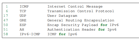 有关协议及其编号的完整列表,请参阅http://en.wikipedia.org/wiki/List_of_IP_protocol_numbers
