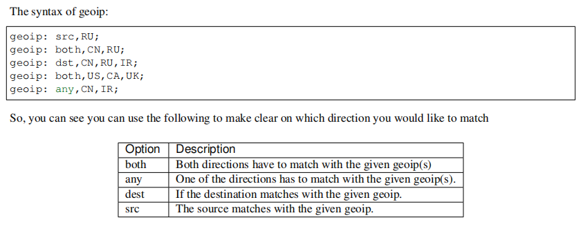 关键字只支持IPv4。 由于它使用Maxmind的GeoIP API,libgeoip必须被编译进来。