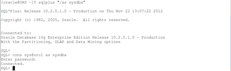 Last login: Mon Nov 26 19:57:06 2012 from 10.0.0.145[root@ORS ~]# su - oracle[oracle@ORS ~]$ sqlplus "/as sysdba"SQL*Plus: Release 10.2.0.1.0 - Production on Mon Nov 26 20:07:33 2012Copyright (c) 1982, 2005, Oracle. All rights reserved.Connected to:Oracle Database 10g Enterprise Edition Release 10.2.0.1.0 - ProductionWith the Partitioning, OLAP and Data Mining optionsSQL> set linesize 300;SQL> set pagesize 30;SQL> select * from scott.emp; EMPNO ENAME JOB MGR HIREDATE SAL COMM DEPTNO---------- ---------- --------- ---------- --------- ---------- ---------- ----------SMITH CLERK 7902 17-DEC-80 800 20ALLEN SALESMAN 7698 20-FEB-81 1600 300 30WARD SALESMAN 7698 22-FEB-81 1250 500 30JONES MANAGER 7839 02-APR-81 2975 20MARTIN SALESMAN 7698 28-SEP-81 1250 1400 30BLAKE MANAGER 7839 01-MAY-81 2850 30CLARK MANAGER 7839 09-JUN-81 2450 10SCOTT ANALYST 7566 19-APR-87 3000 20KING PRESIDENT 17-NOV-81 5000 10TURNER SALESMAN 7698 08-SEP-81 1500 0 30ADAMS CLERK 7788 23-MAY-87 1100 20JAMES CLERK 7698 03-DEC-81 950 30FORD ANALYST 7566 03-DEC-81 3000 20MILLER CLERK 7782 23-JAN-82 1300 10rows selected.SQL> |