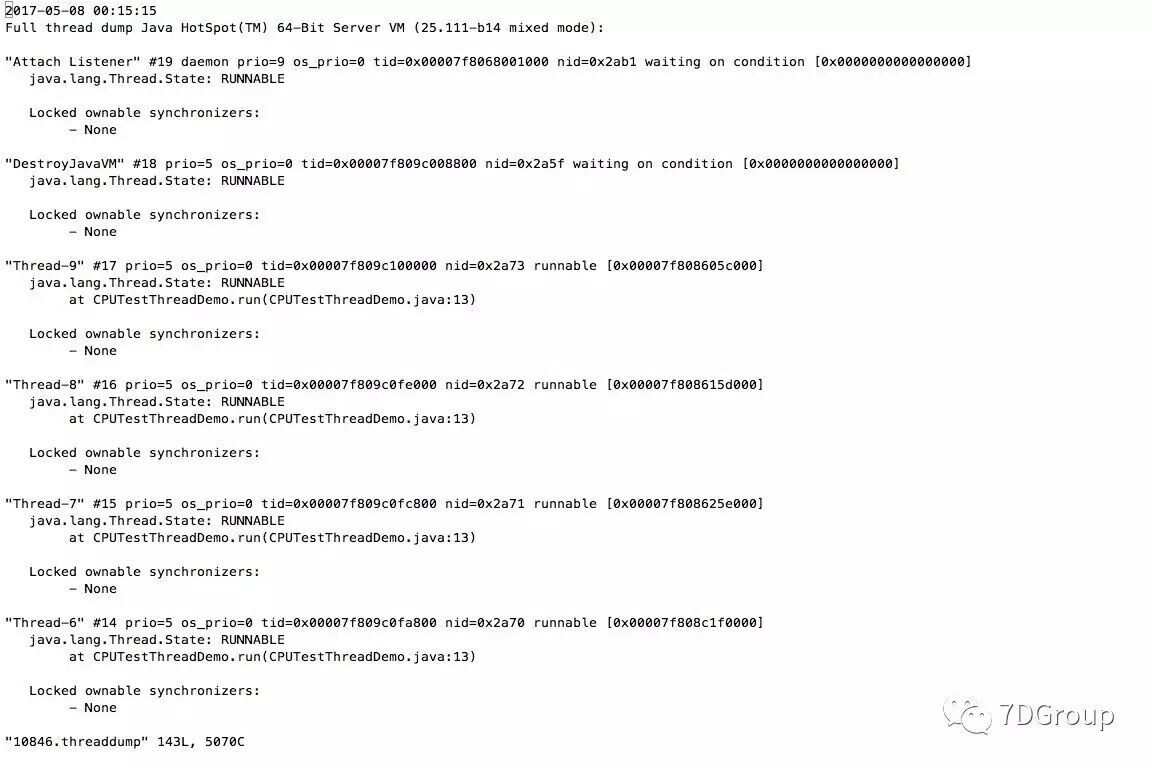 [root@7dgroup ~]# jstack -l 10846 > 10846.threaddump