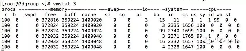 下面来操作一下,首先执行一个消耗CPU的JAVA实例(实例是7D Group成员所编,有兴趣动手操作的可以到网上随便找一个小例子或自己编写一个)。查看vmstat的状态。