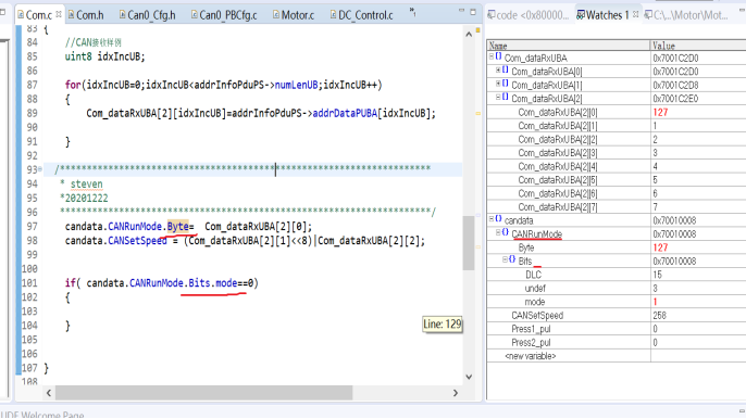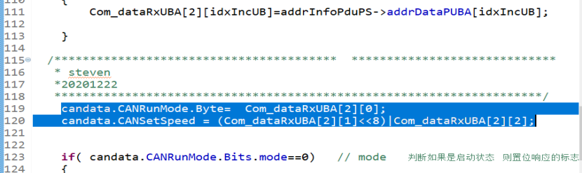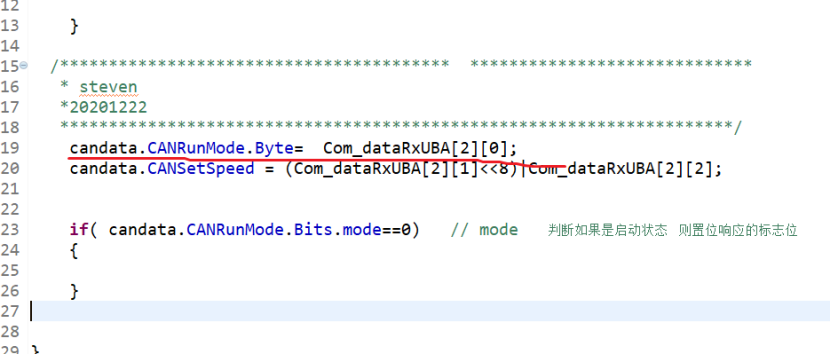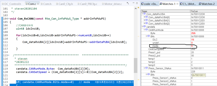 if( candata.CANRunMode.Bits.mode==0) // mode 判断如果是启动状态 则置位响应的标志位
