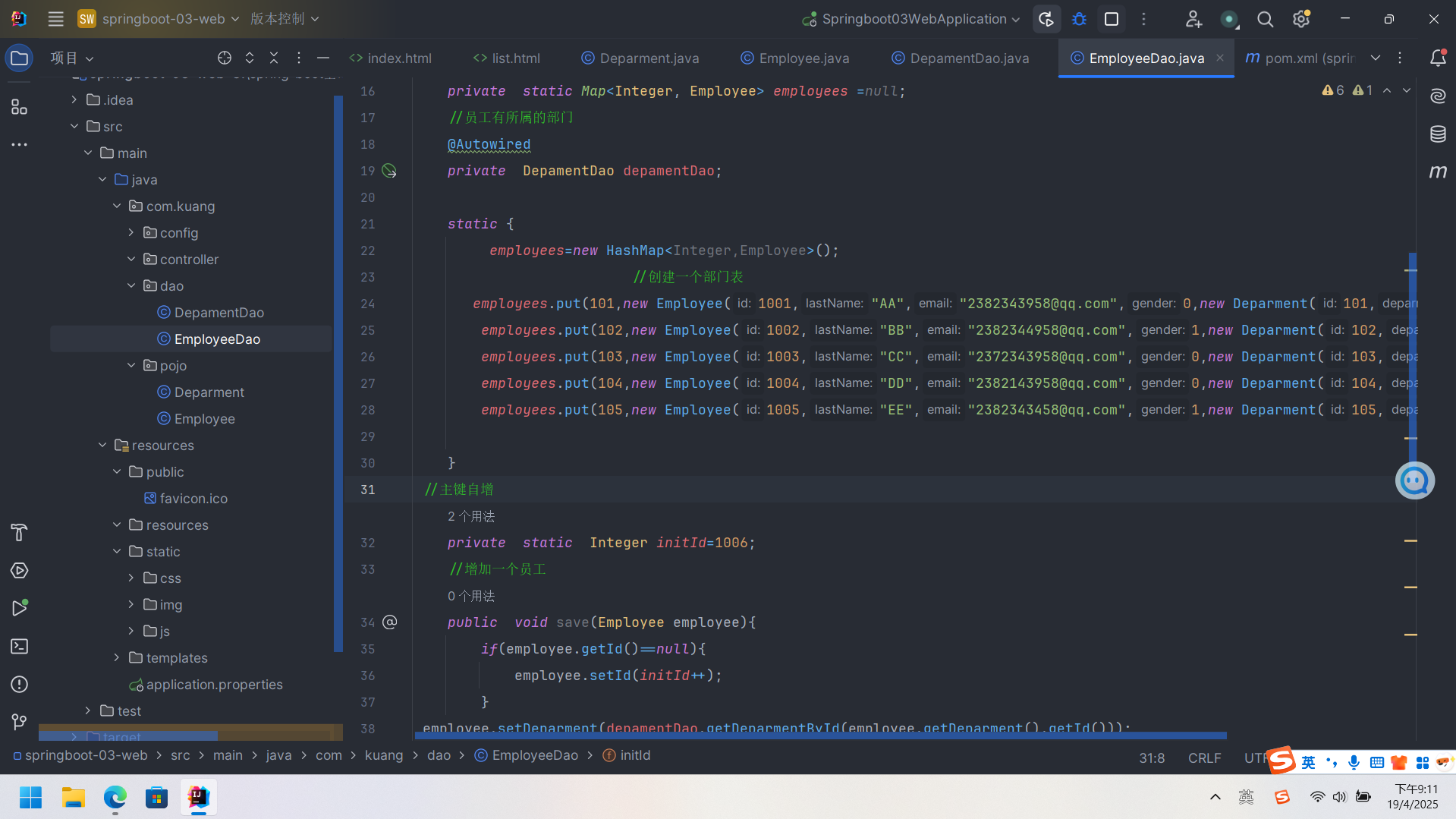 employees.put(103,new Employee(1003,"CC","2372343958@qq.com",0,new Deparment(103,"销售部")));