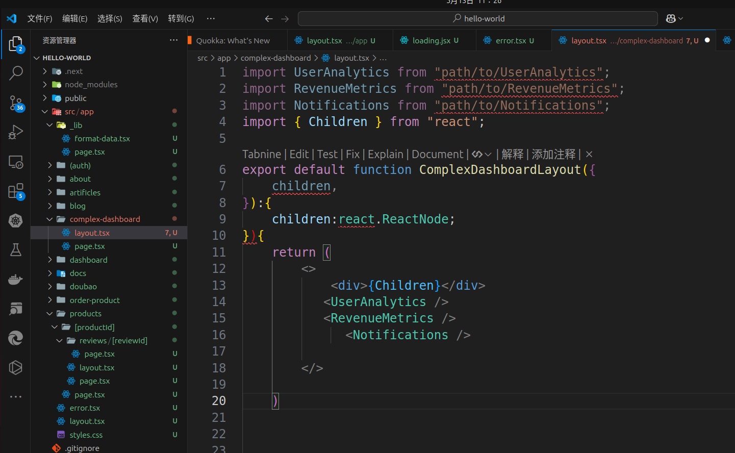 接下来我们开始使用插槽,tsx文件的好处是它们自动作为道具传递给我们,布局组件不需要再进行导入。这里我们为你准备了layout.tsx相应的代码