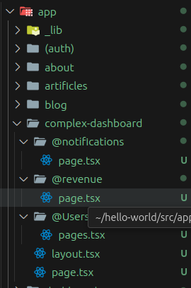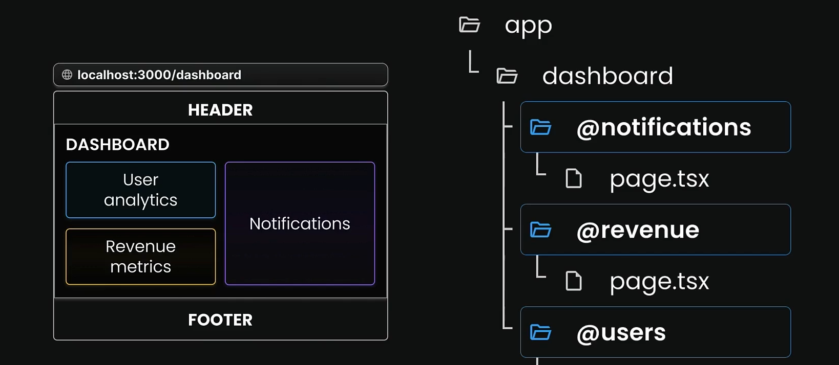 这里我们开始展示我们的目录结构,并行路由要求我们的段同在于一个父类下,同时我们插槽的功能实现是依据与根路由,而在@notifications,@revenue,@Users下文件默认导出名为通知的反应组件,该返回值是一个带有di标签,