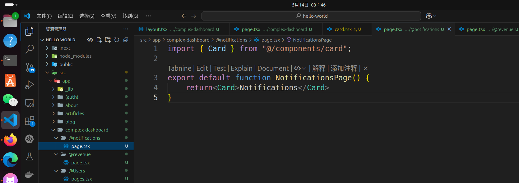 这里我们开始创建页面结构能够让你更好的去实现同样的功能。这里我们再创建一个complex-dashboard.tsx文件,这里我们可以先简单看一下代码结构以及示例,