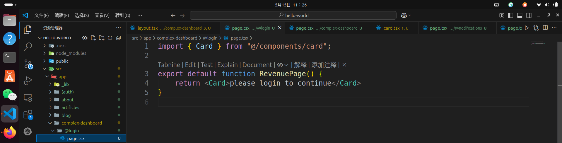 同样的利用之间我们所运用的插槽,将其放入到complex-dashboard文件的layout.tsx中,这里我们引入login页面,并设置返回值,将当前isLoggedIn的值设置为false,并在底部输出login,这里我们已经为你准备好了代码