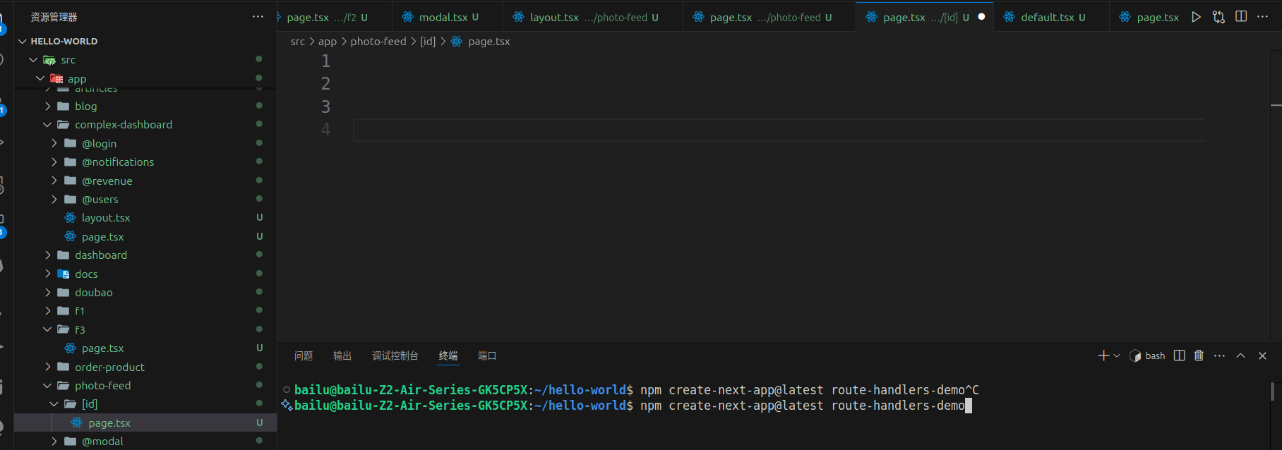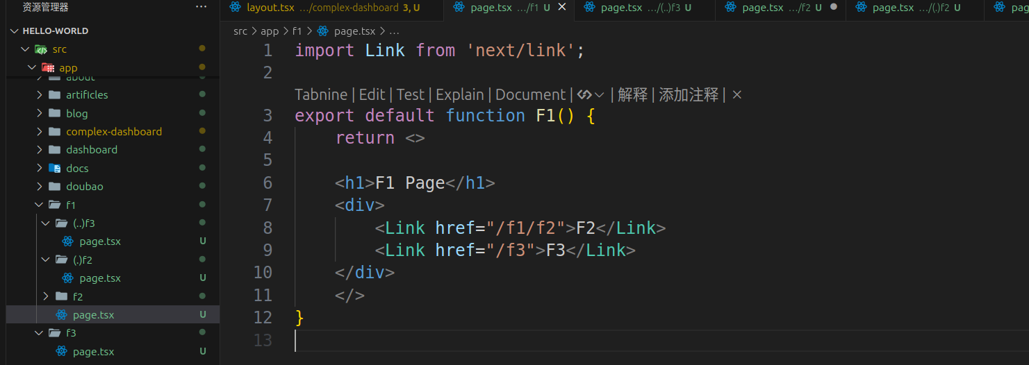 好的让我们接下来看一下目录 ,这里我们在app目录下创建f1,并在f1下创建f2,f3。这里我们需要知道nextjs对于拦截路由的文件定义为(.)<文件名>,因此我们将f2f3设置为拦截路由文件。同样的默认导出di