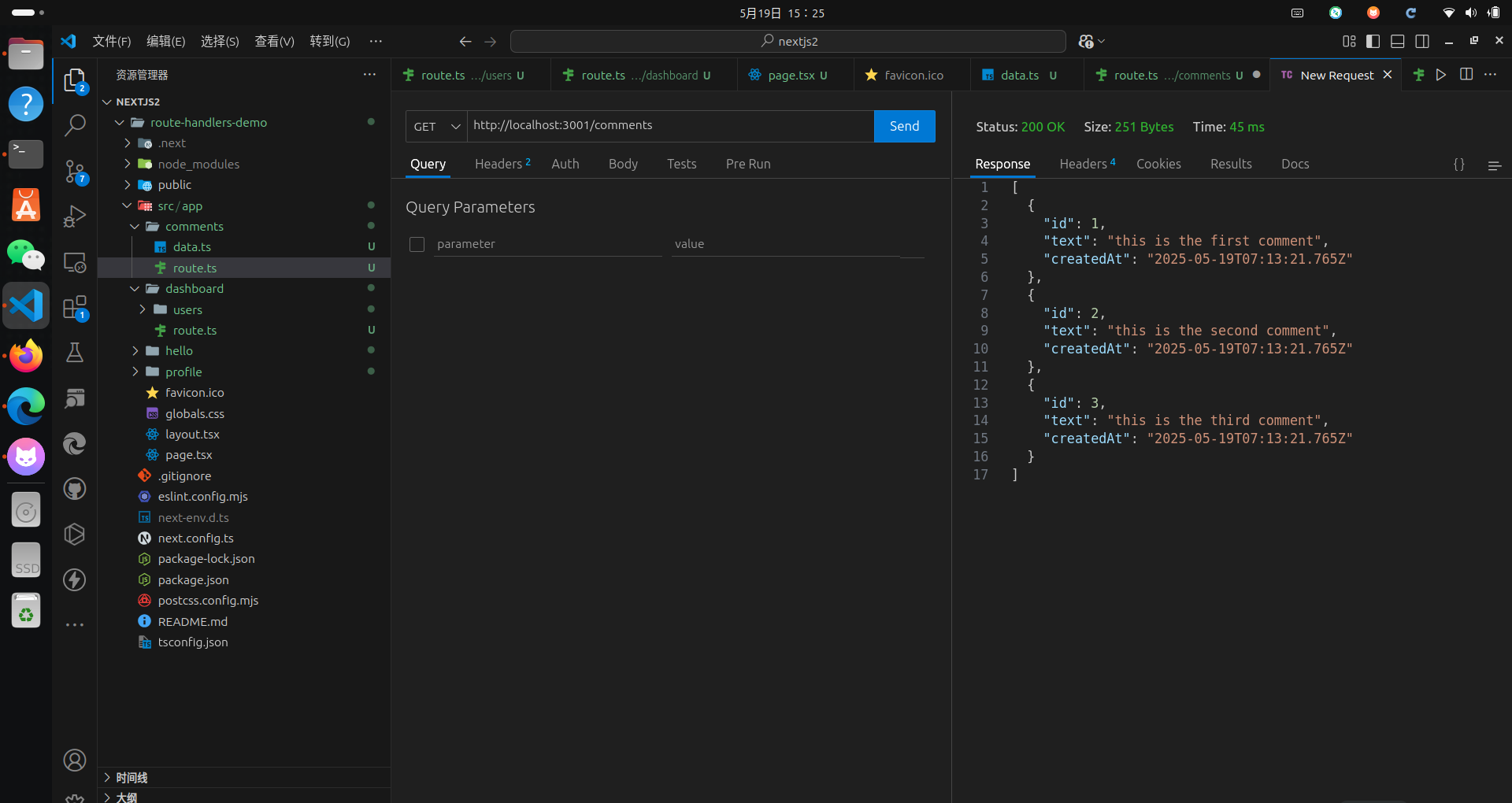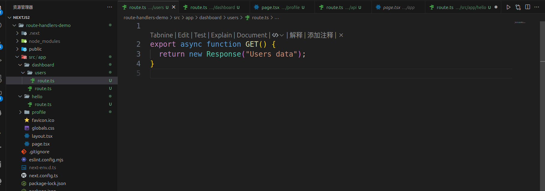 同样的路由作为一种文件系统,依然支持创建嵌套的关系,这里我们再此创建dashboard/route.ts ,并在dashboard下创建users/route.ts