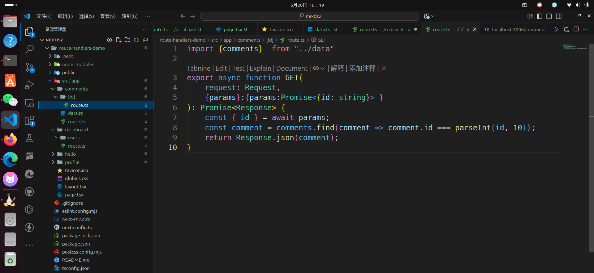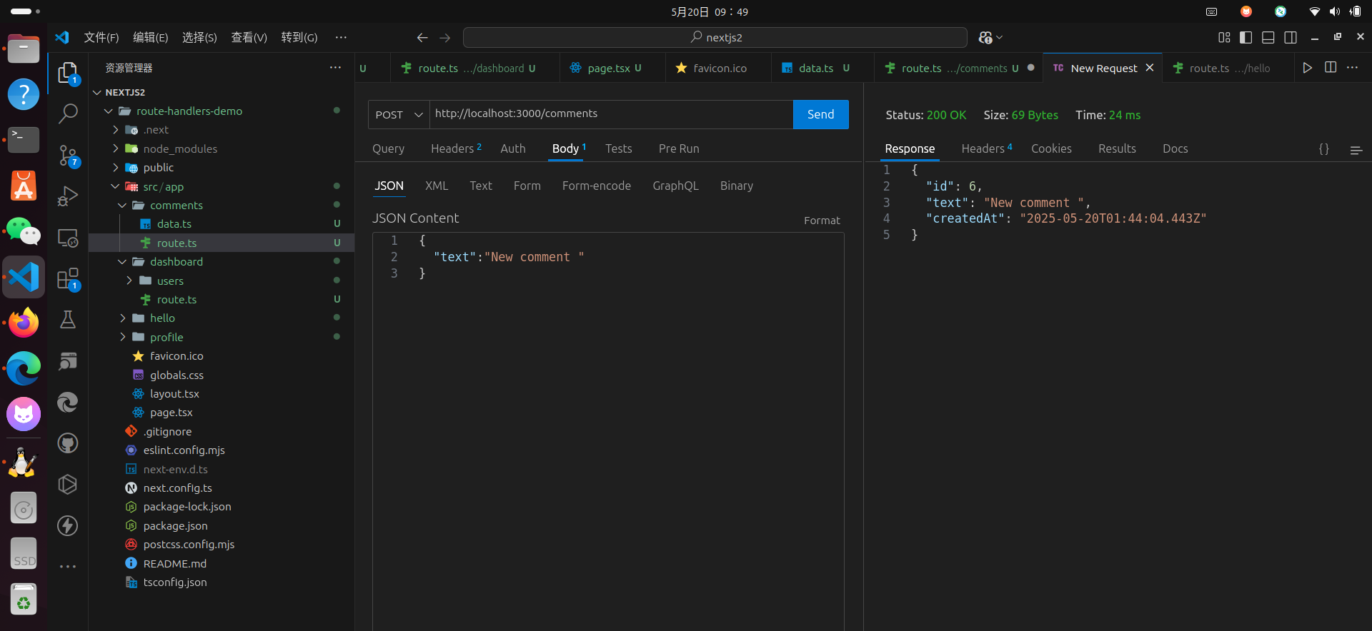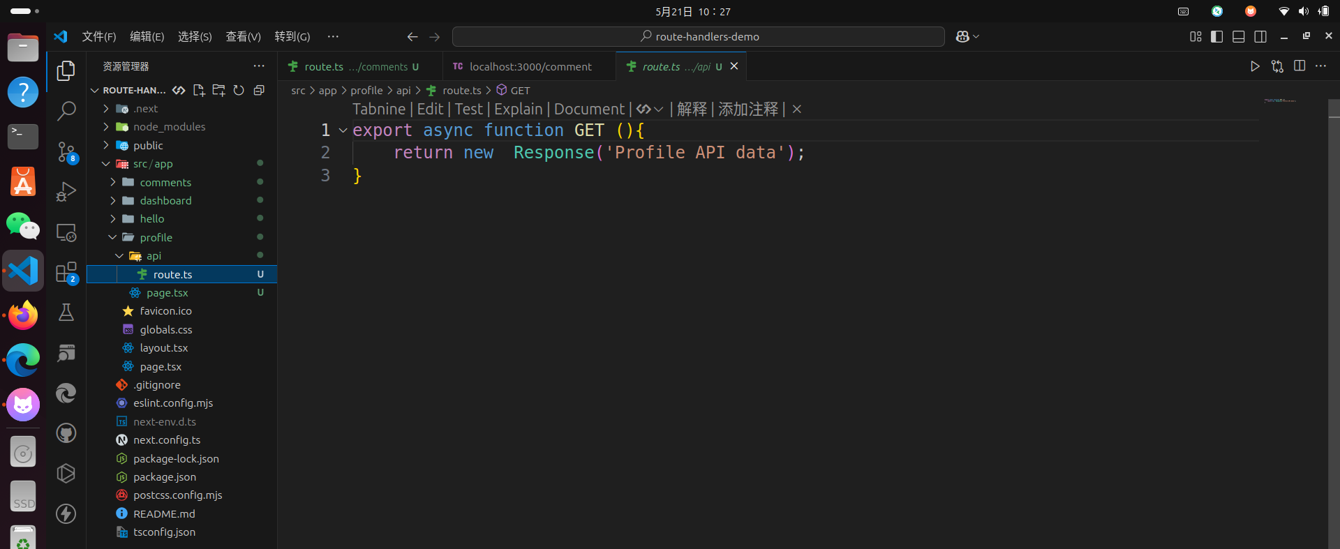 这里我们新建一个nextjs文件,以便我们能够更好的清楚项目路由,同样的我们在app目录下创建一个hello/route.ts文件,这里我们运用了ES6的异步函数,并使用了Response对象返回了一个简单的字符串。