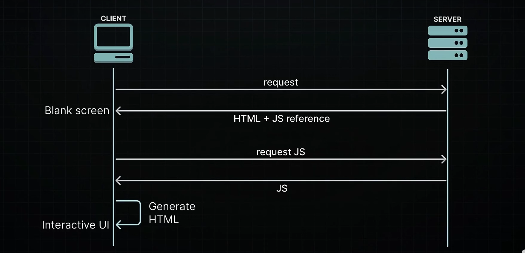 这里我们需要看看过去的十年react是如何进行演变的,这里我们来看一下react的渲染策略,服务器通过整个方法发送原始的HtML,其中你的浏览器将react组件转化为你在屏幕上看到的效果。这就是我们能说的客户端渲染,简称CSR,全称为Client-Side of Rendering,然而不久之后,开发人员发现了它存在的问题,开始注意到这种方法有固有的一些缺陷,第一个问题是:当SEO搜索引擎想要去抓取你的网站的时候,由于是用的HTML,从而当查看的时候只会看到是一个空的di盒子,这对于视图来说并不友好,而当你有很多页面进行嵌套的时候,同样的也无法及时加载。第二个问题是:用户体验效果很差,设想一下你的浏览器需要及时反应出页面效果,以及一些逻辑交互。SEO,无法及时的反馈出页面,这对于大部分用户来说是很不友好的,较差的用户体验会让他们觉得体验效果很差,因此我们在接下来的内容中去解决这些问题。