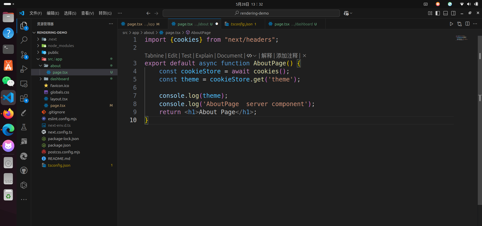 这里我们来做一个代码进行演示,我们在app/about,这里可以看到我们为该页面设置了一些盒子以及文字的输出,当我们测试这个端口的时候会提示报错。这里可以通过报错得知我们需要的是将模块更改为客户端的形式。