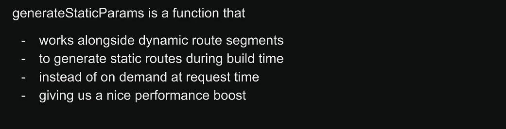 生成静态参数是一个与动态路由一起工作的功能,用于在工作的时候生成动态路由而不是当项目中出现请求,这同时有一个特点就是为我们提供了更好的性能。