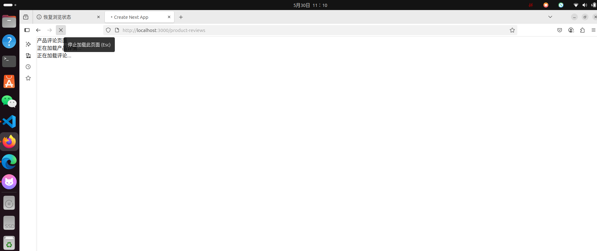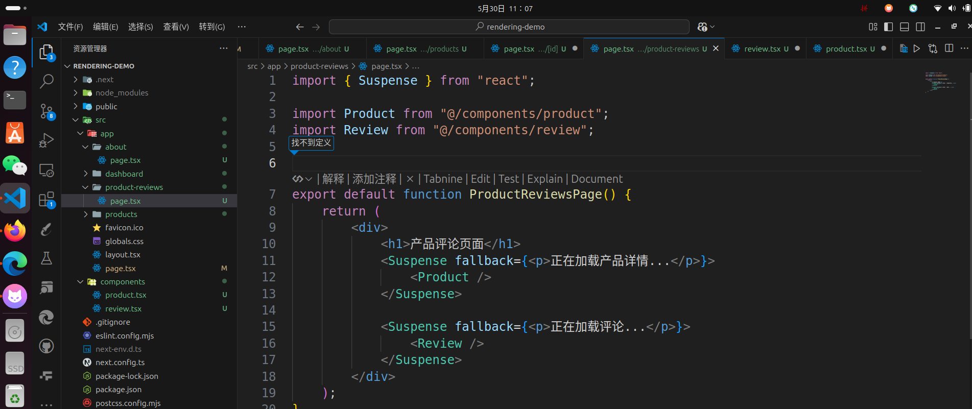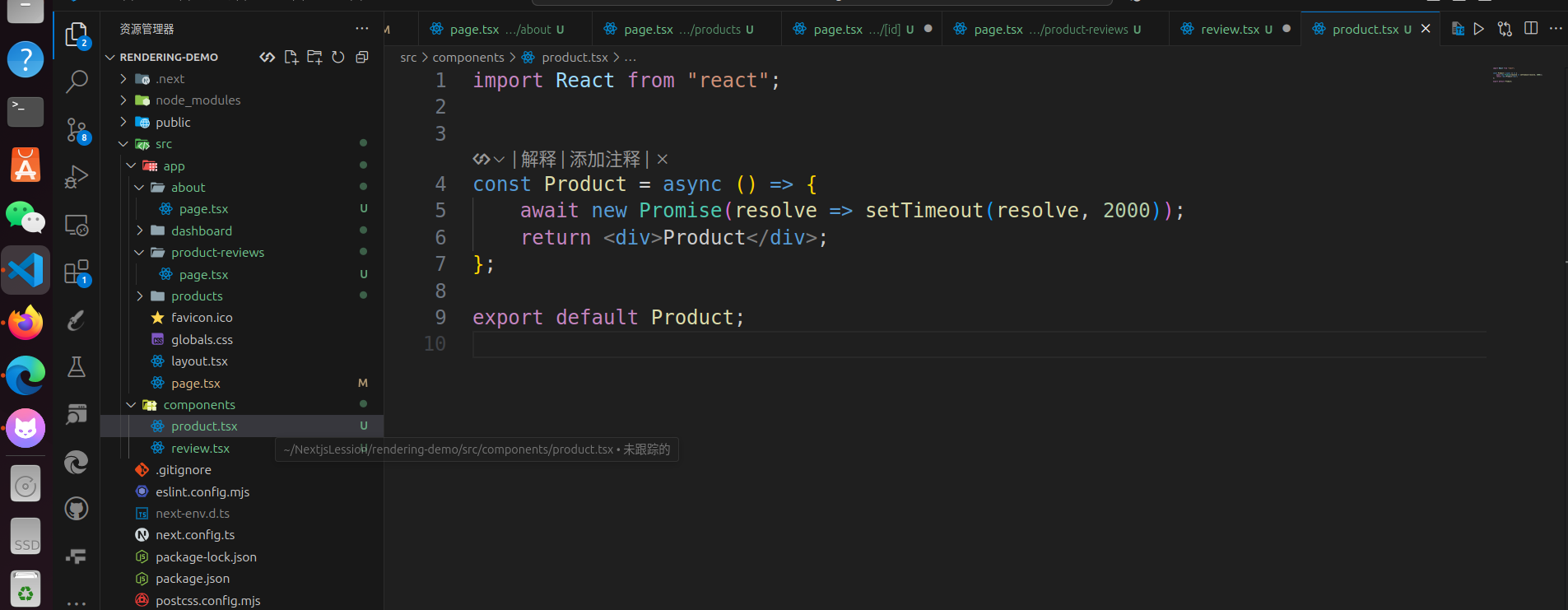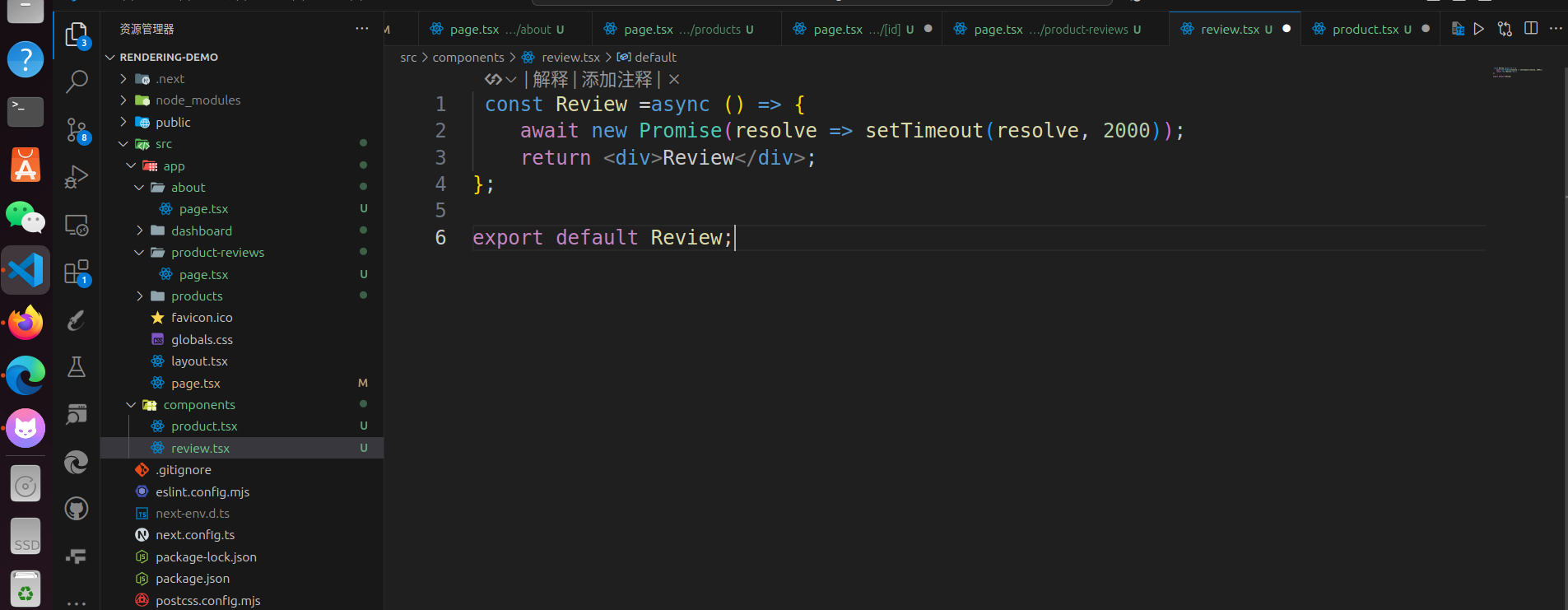 同样的这里需要我们在app/product-review。product-review/page.tsx,这里我们能看到,我们导入了两个组件:Product和Review。 然后我们在ProductReviewsPage函数组件中,返回了一个div元素,包含一个h1元素和两个Suspense元素。 第一个Suspense元素渲染的是Product组件,第二个Suspense元素渲染的是Review组件。 这两个Suspense元素的fallback属性指定了加载过程中显示的占位符。 这样,当Product组件和Review组件的异步数据加载过程中,页面上会显示一个加载提示。 当数据加载完成后,页面上会显示Product组件和Review组件的内容。