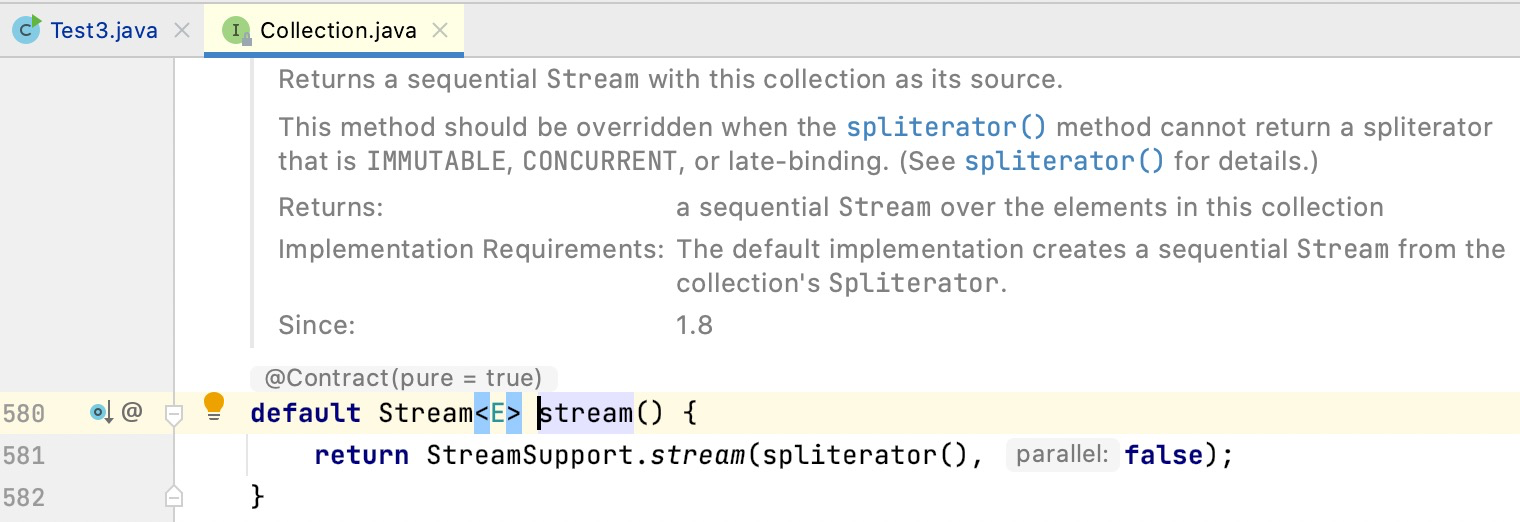 /** * Returns a sequential(串形) {@code Stream} with this collection as its source. * * <p>This method should be overridden when the {@link #spliterator()} * method cannot return a spliterator that is {@code IMMUTABLE(并发的)}, * {@code CONCURRENT(不可变的)}, or <em>late-binding(延迟绑定的)</em>. (See {@link #spliterator()} * for details.) * * @implSpec * The default implementation creates a sequential {@code Stream} from the * collection's {@code Spliterator}. * * @return a sequential {@code Stream} over the elements in this collection * @since 1.8 */