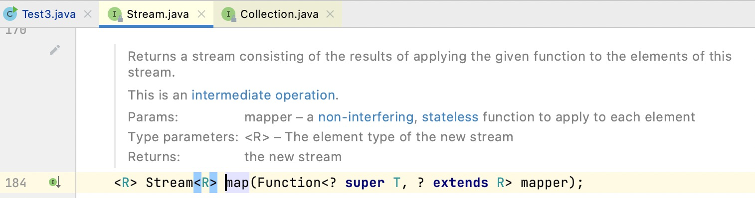 /** * Returns a stream consisting(组成) of the results of applying the given * function to the elements of this stream. * * <p>This is an <a href="package-summary.html#StreamOps">intermediate * operation(中间操作)</a>. * * @param <R> The element type of the new stream * @param mapper a <a href="package-summary.html#NonInterference">non-interfering(无干扰)</a>, * <a href="package-summary.html#Statelessness">stateless(无状态)</a> * function to apply to each element * @return the new stream */