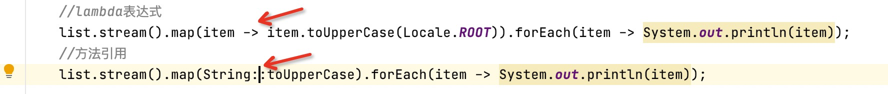 使用?String::toUpperCase是方法引用,类名直接引用共有方法,类名.共有方法不可行,因为方法不是静态方法,但是方法引用就可以