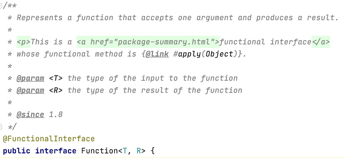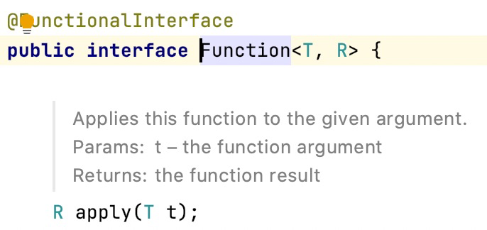 /** * Represents(代表) a function that accepts one argument and produces a result. * * <p>This is a <a href="package-summary.html">functional interface</a> * whose functional method is {@link #apply(Object)}. * * @param <T> the type of the input to the function * @param <R> the type of the result of the function * * @since 1.8 */